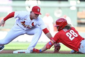 He was called, but Phillies challenged the call. The umpires ruled that second baseman Nolan Gorman got the tag.